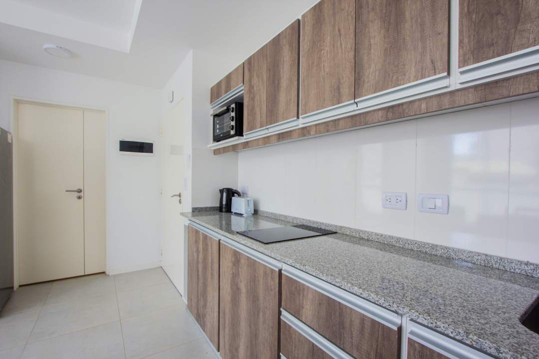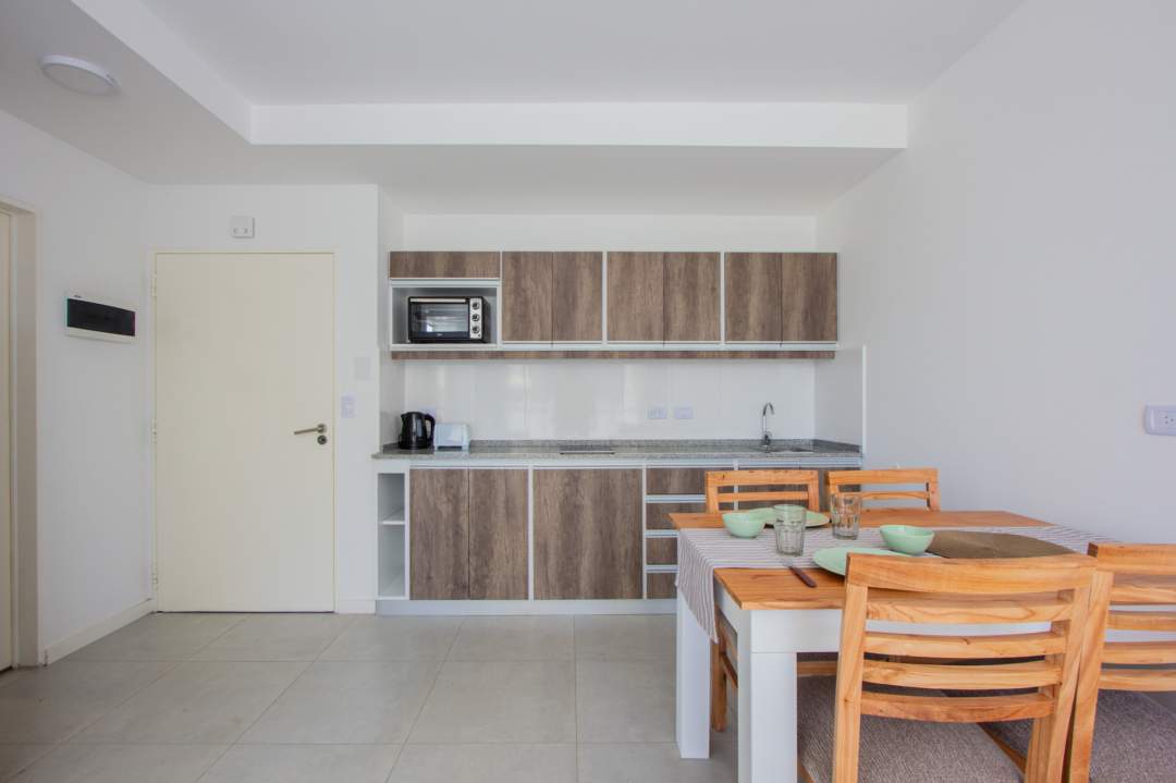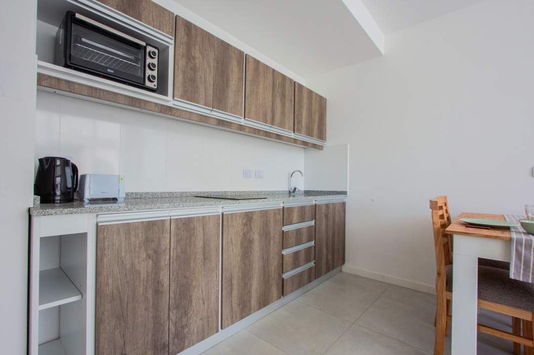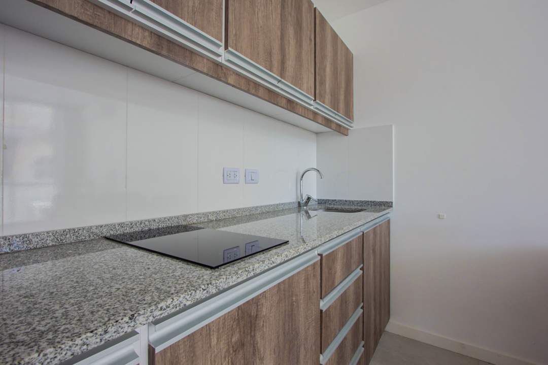 Living comedor con cocina integrada con muebles bajo mesada y alacenas. Baño completo!