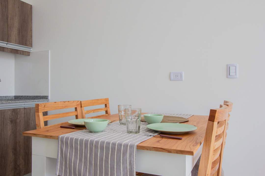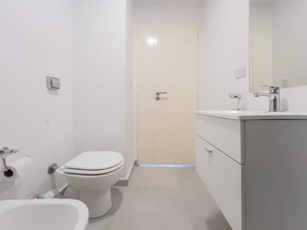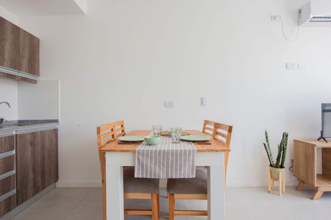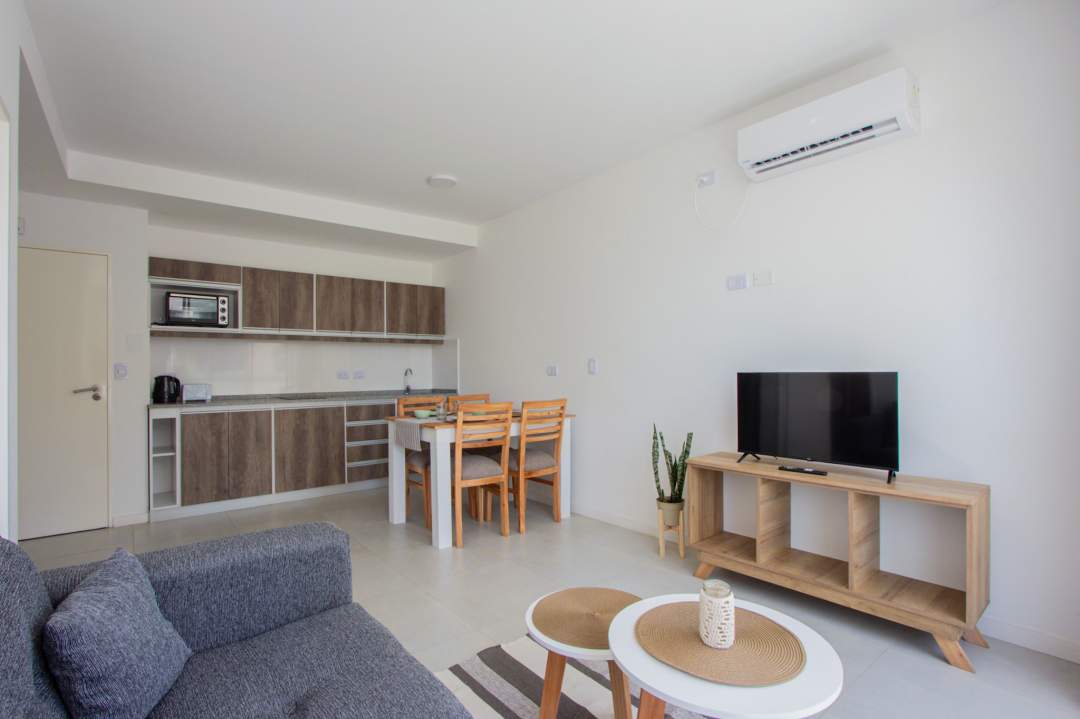 Living comedor con cocina integrada con muebles bajo mesada y alacenas. Baño completo!